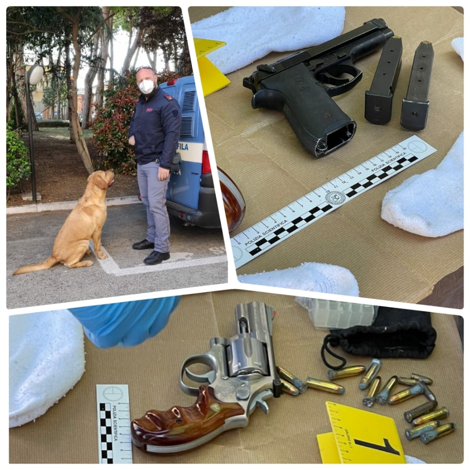 L’attività info-investigativa è stata svolta in collaborazione con il personale della Squadra Amministrativa. E l’intuizione degli investigatori si è rivelata giusta: in uno scantinato recintato erano nascoste una pistola semiautomatica Beretta calibro 9×21 con la matricola abrasa (con due caricatori riforniti di 9 e 15 cartucce) e un revolver Smith & Wesson calibro 357 con 4 cartucce inserite nel tamburo, arma risultata rubata in provincia di Pescara nel 2013. Sono state rinvenute anche 33 cartucce di cui 25 con calibro 38 special ed 8 con calibro 6.35. Alla perquisizione ha partecipato anche un’unità cinofila della Polizia di Stato con il cane Master, specializzato nella ricerca degli esplosivi che con il suo fiuto infallibile ha indicato il punto esatto in cui le armi erano nascoste. P.V. di 32 anni, proprietaria dell’immobile, residente in zona Rancitelli, è stata arrestata in flagranza per detenzione illecita di armi da sparo e, su disposizione dell’Autorità Giudiziaria, é stata posta agli arresti domiciliari.
