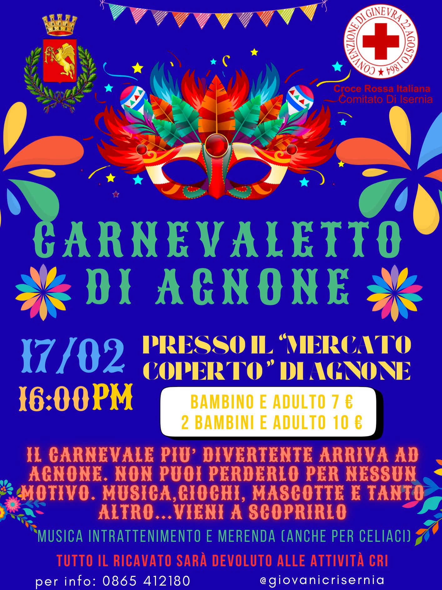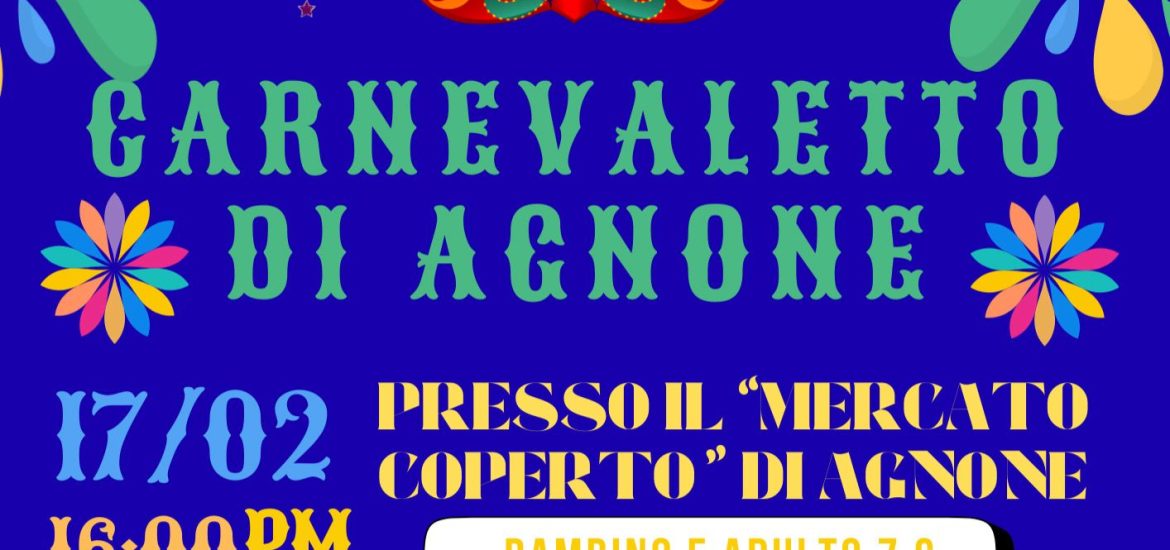 Lunedì 17 febbraio, a partire dalle ore 16, il Mercato coperto ospiterà il “Carnevaletto di Agnone”, evento promosso dalla Croce Rossa Italiana – Comitato di Isernia, con il supporto istituzionale del Comune.