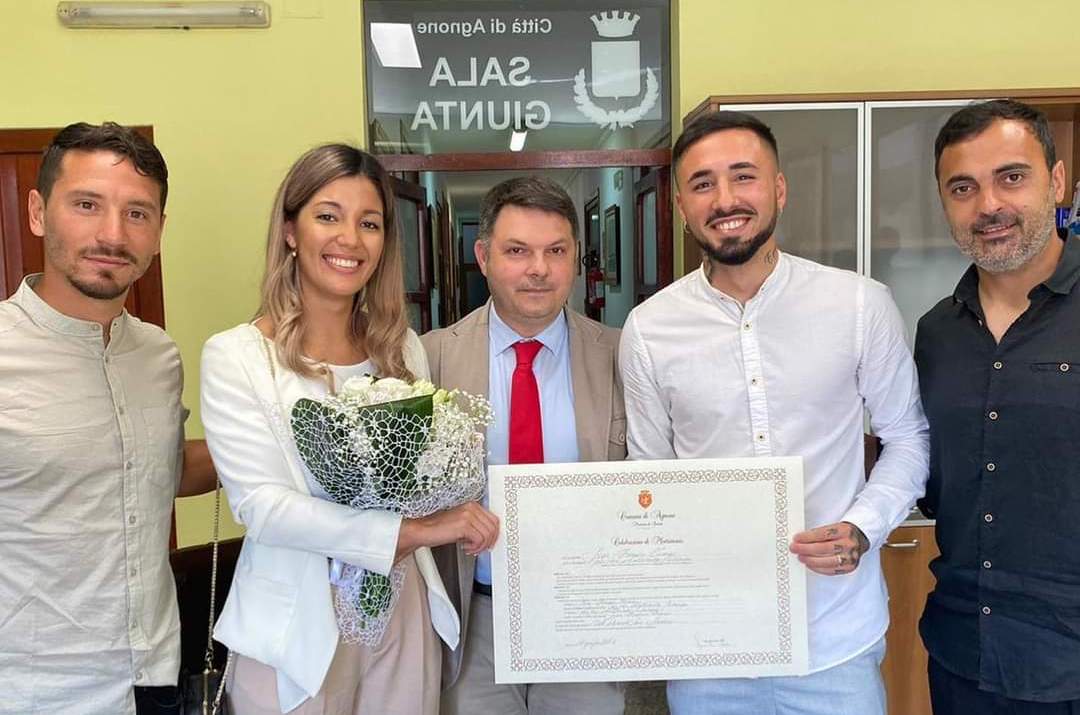 Sposi ad Agnone. Franco Sosa, attaccante argentino, in forza all’Olympia, questa mattina, nella sala giunta del Comune altomolisano, ha promesso amore eterno alla sua dolce metà, Antonela Rojas. Con rito civile, ad unirli in matrimonio il sindaco Daniele Saia. Testimoni di nozze il tecnico ed ex difensore del Napoli, Erminio Rullo e il connazionale e compagno di reparto, il centravanti, Federico Amaya. A Franco e Antonela i migliori auguri dalla redazione de l’Eco de l’Alto Molise – Vastese.