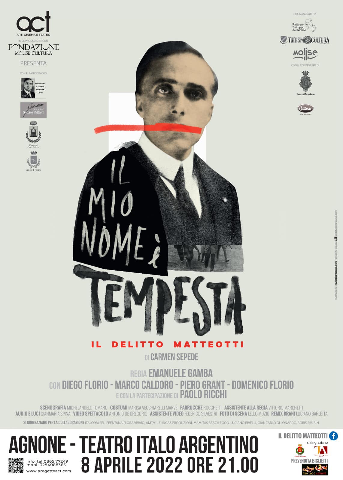 «Il mio discorso l’ho fatto. – le parole che Matteotti rivolse ai compagni di partito al termine dell’intervento – Ora voi preparate il discorso funebre per me». Parole che, rilette oggi, suonano come una profezia. Matteotti sapeva di rischiare la morte. In maniera parallela all’attività politica, da giornalista, il deputato aveva denunciato una vicenda ancora più scottante: le presunte tangenti pagate dalla compagnia americana Sinclair Oil per ottenere la concessione delle trivellazioni petrolifere in Italia. Vicenda che, secondo accertamenti e ricostruzioni accurate, chiamava in causa il fratello del Duce, Arnaldo Mussolini. Una storia pericolosa che Matteotti aveva ricostruito in un articolo indirizzato alla rivista “English Life” e della quale aveva parlato con la moglie, la poetessa Velia Titta, salutandola pochi minuti prima del rapimento. Un dramma e un giallo, quello ricostruito nello spettacolo teatrale “Il mio nome è tempesta. Il delitto Matteotti”, scritto dalla giornalista Carmen Sepede, diretto da un regista di fama nazionale come Emanuele Gamba e portato in scena dalla Compagnia Act di Campobasso.