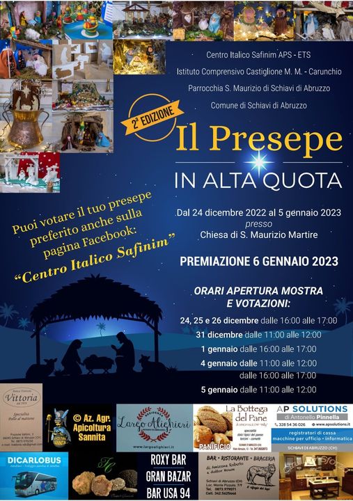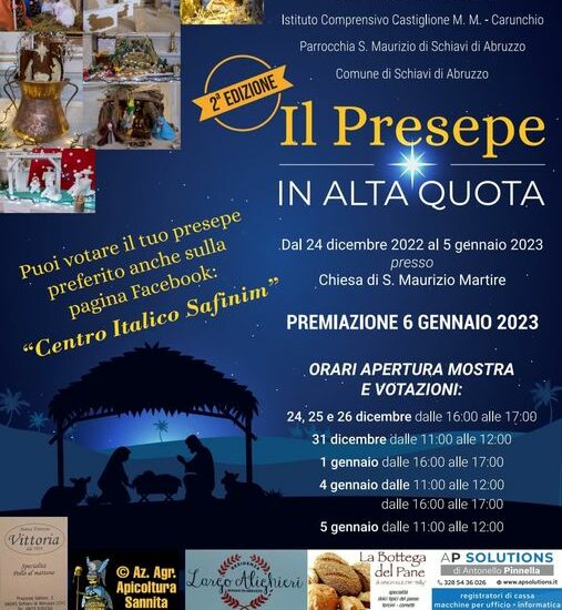 Il Centro Italico Safinim aps dà il via alla seconda edizione del concorso “Il presepe in alta quota”. L’associazione, in collaborazione con il Comune di Schiavi di Abruzzo, la parrocchia di San Maurizio Martire, l’Istituto Comprensivo Castiglione Messer Marino Carunchio e la scuola paritaria dell’infanzia “Ambrogio Sbrocco” di Castiglione M.M., dal 24 dicembre 2022 al 5 gennaio 2023 invita presso la Chiesa Madre di San Maurizio Martire di Schiavi di Abruzzo, alla mostra dei presepi.