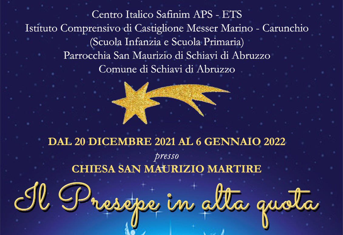 Il Centro Italico Safinim, in collaborazione con il Comune di Schiavi di Abruzzo, la parrocchia di San Maurizio Martire, l’istituto comprensivo Castiglione Messer Marino – Carunchio e la scuola paritaria dell’infanzia “Ambrogio Sbrocco” di Castiglione, dal 20 dicembre al 6 gennaio, in occasione della prima edizione del concorso “Il Presepe in alta quota”, invita alla mostra dei presepi, ideati e creati con tanta fantasia dai bambini, presso la chiesa di San Maurizio Martire a Schiavi.