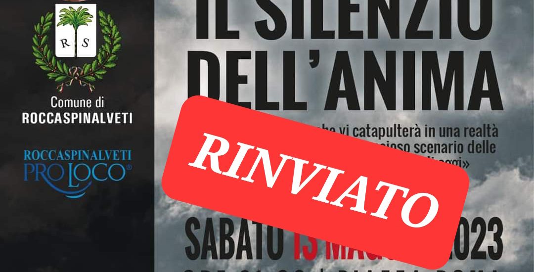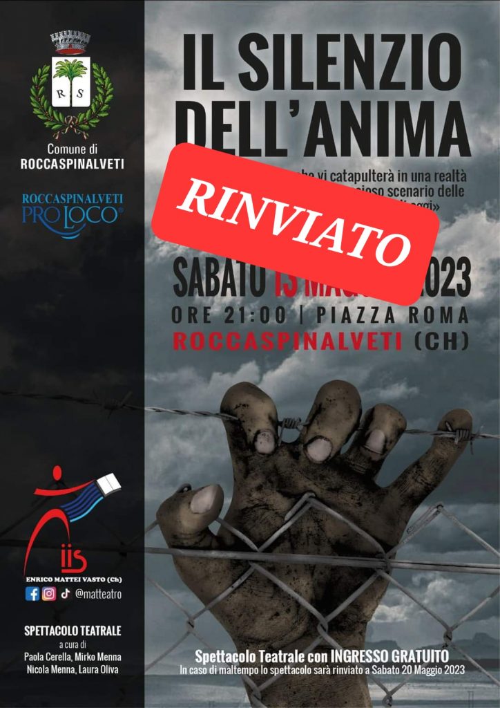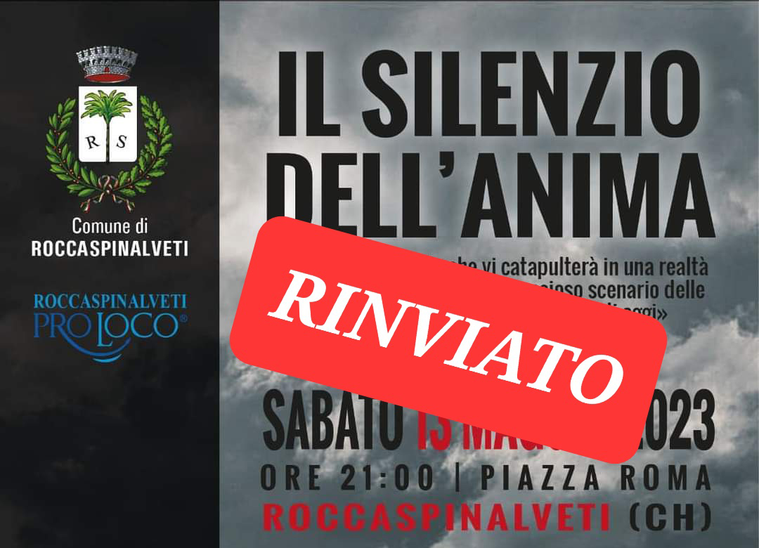 L’associazione Pro Loco di Roccaspinalveti comunica che lo spettacolo teatrale “Il silenzio dell’anima” previsto per la serata di sabato, è stato precauzionalmente rinviato a nuova data in relazione alle previsioni meteo. Lo spettacolo andrà dunque in scena sabato 20 maggio.