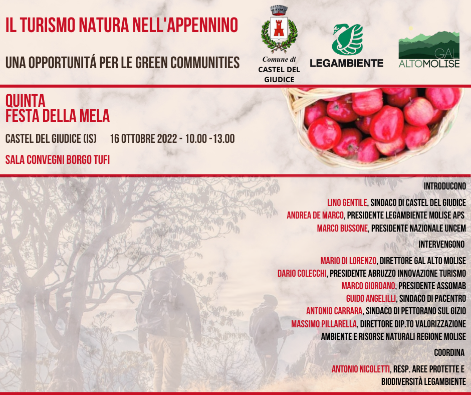 Tra gli eventi speciali della 5° Festa della Mela – Edizione Esperienziale di Castel del Giudice del 15 e 16 ottobre 2022, domenica mattina, alle 11, nella sala conferenze di Borgotufi, l’albergo diffuso del paese alto molisano al confine con l’Abruzzo, si terrà il convegno “Il turismo natura nell’Appennino. Una opportunità per le Green Communities”. Nel Comune di Castel del Giudice si torna a parlare di un tema fondamentale per lo sviluppo delle aree interne appenniniche: la Green Community, strategia territoriale che ha l’obiettivo di rivitalizzare le comunità rurali e montane in chiave di sostenibilità ambientale, attraverso un uso efficace ed efficiente delle risorse naturali, creando un contesto che favorisca politiche di investimento a sostegno delle zone marginali, con attività a basso impatto ambientale, agricoltura di qualità, filiere virtuose del bosco, energie rinnovabili, efficientamento energetico.