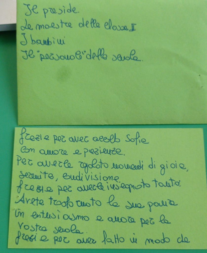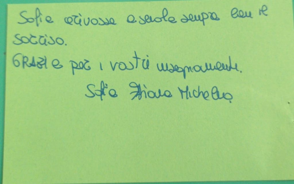 Ringrazio la scuola, le maestre della classe seconda, che ci hanno veramente aiutato tanto, sia dal punto di vista umano che didattico. I compagni di classe. Ho visto Sofia frequentare la scuola con il sorriso. Ringrazio te Sofia, chiamandoti la mia stella stella (mi sono sempre sforzata di non chiamarti amore mio, perché mi sembrava irrispettoso verso la tua mamma).