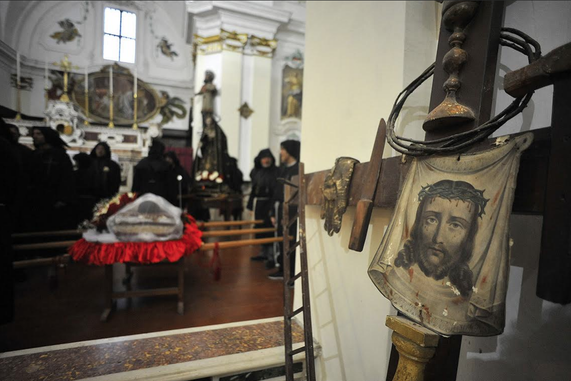 All’interno della chiesa, la statua del Cristo giace coperta da un velo trasparente, circondata da fiori e drappi rossi. I fedeli si radunano attorno a questa rappresentazione del Salvatore crocifisso, le loro figure incappucciate creano un forte contrasto con gli ornati interni bianchi e dorati della chiesa. Altra istantanea cattura donne con tradizionali mantelle nere di pizzo, le loro espressioni riflettono la gravità dell’occasione. La presenza femminile in abiti da lutto collega le partecipanti contemporanee a generazioni di donne che hanno osservato questi rituali nel corso dei secoli.