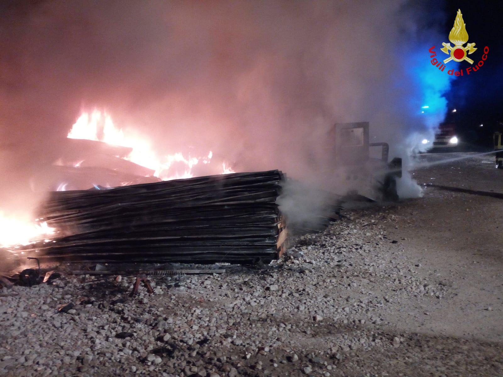 Incendio in un cantiere, notte tra le fiamme per i Vigili del fuoco.