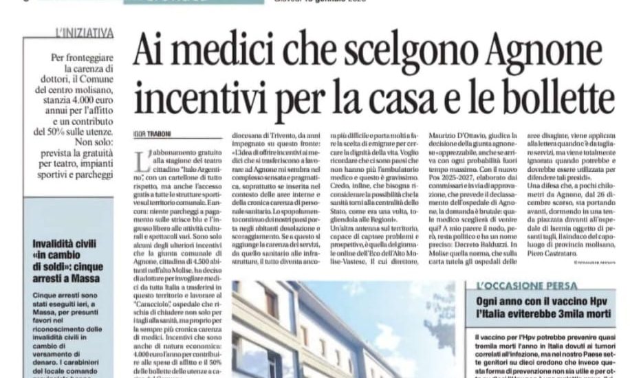 LEGGI QUI L’ARTICOLO: https://www.avvenire.it/attualita/ai-medici-che-scelgono-agnone-incentivi-per-casa-bollette-e-tempo-libero_103244