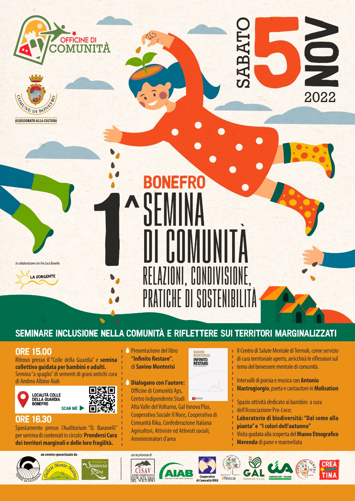 L’incontro di sabato 5 novembre 2022, a partire dalle ore 15, sarà caratterizzato da una “Semina Collettiva” in campo, quale momento simbolico di incontro e condivisione di pratiche di sostenibilità, con la guida di Andrea Albino di Aiab Abruzzo-Molise; seguirà uno spazio di dialogo in circolo presso l’auditorium dell’ex  Convento S. Maria delle Grazie, prendendo spunto dall’incontro con Savino Monterisi che presenterà il suo ultimo libro: “Infinito restare”. Gli interlocutori saranno molteplici: Centro Indipendente alta Valle del Volturno, Gal Innova Plus, Cooperativa di Comunità Rika, Cooperativa Sociale Il Noce, Confederazione Italiana Agricoltori, Attiviste ed Attivisti sociali e Amministratori d’area. Le riflessioni saranno inoltre arricchite dal dott. Alessandro Gentile psichiatra del Centro di Salute Mentale di Termoli sul tema del benessere mentale di comunità. Sarà riservato uno spazio laboratorio per i più piccoli sulla biodiversità a cura dell’associazione pro-loco di Bonefro. Nel corso dell’incontro ci saranno intervalli di poesia e musica del poeta e cantautore Antonio Mastrogiorgio in Molisation.