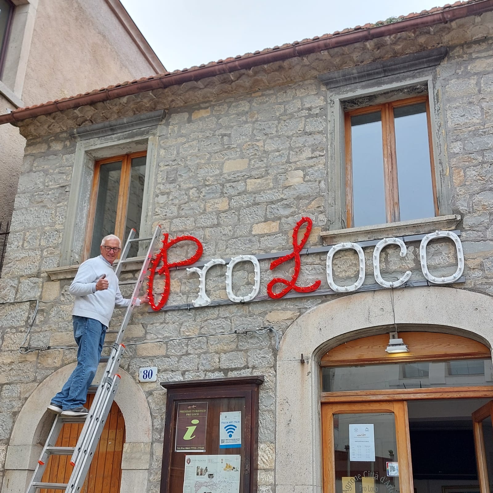 E’ il messaggio di ringraziamento all’indirizzo di Clemente Zarlenga, un cittadino agnonese bravo nella realizzazione di luminarie artistiche, inviato dall’associazione Proloco di Agnone. Il pensionato ha infatti realizzato e installato una insegna luminosa che da ieri fa bella mostra di sé al di sopra della porta di ingresso della sede e del punto informativo della Proloco.