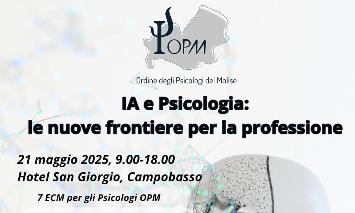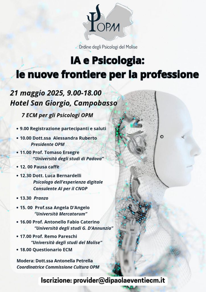 L’iniziativa, in programma per il 21 maggio dalle ore 9 alle ore 18, presso l’Hotel San Giorgio di Campobasso, è rivolta agli psicologi iscritti all’ordine e intende aprire un confronto di alto profilo scientifico e culturale sul ruolo dell’Intelligenza Artificiale nel futuro della psicologia, coinvolgendo studiosi, esperti e rappresentanti del mondo accademico e istituzionale provenienti da rinomate università italiane.