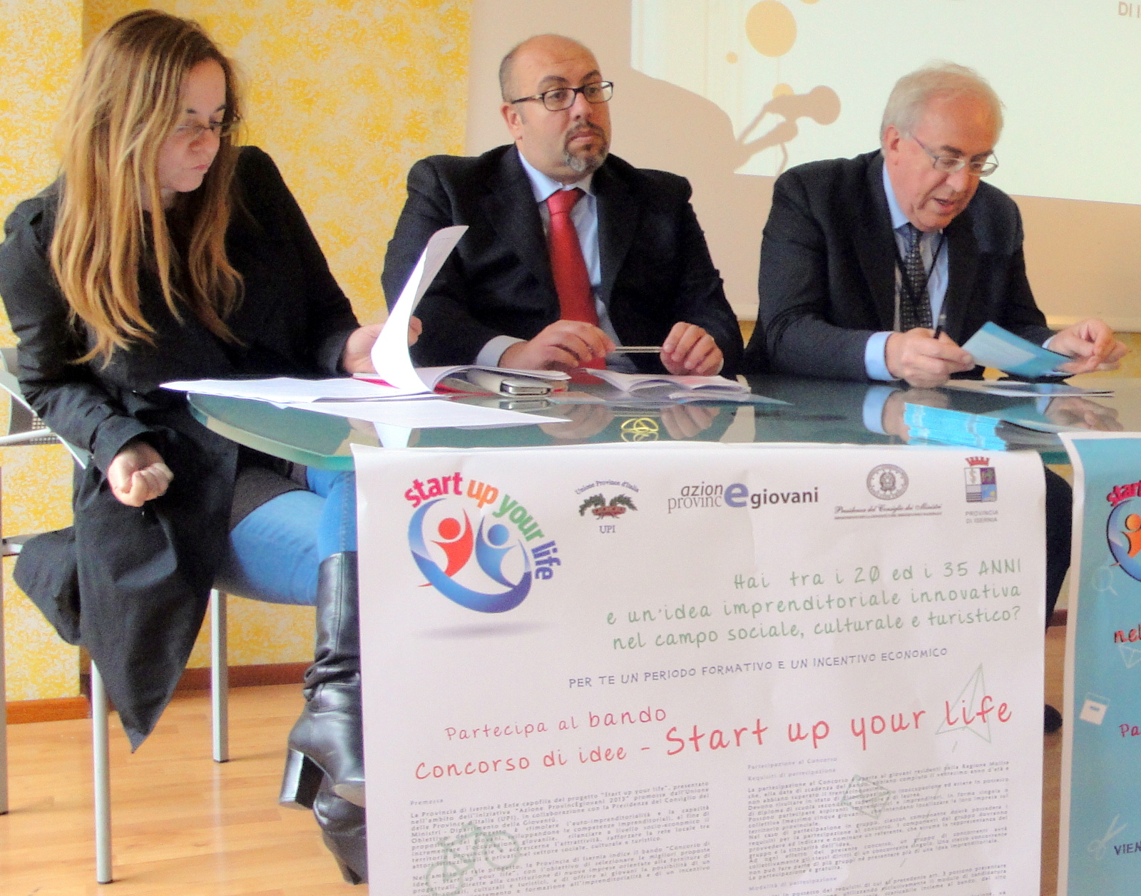 ‘Start Up Your Life’, finanziato nel quadro di ‘Azione ProvincEgiovani 2013’, promossa dall’Unione delle Province d’Italia (UPI), in collaborazione con la Presidenza del Consiglio dei Ministri – Dipartimento della Gioventù, è stato presentato alla presenza del presidente Luigi Mazzuto, del presidente del Consiglio provinciale Lauro Cicchino, dell’assessore alle Politiche Giovanili Andrea Di Lucente, del direttore di Sfide Eugenia Ferrari e del presidente di LegaCoop, anche rappresentante di Confcooperative Giovanni Cefalogli. Si tratta di un’iniziativa finanziata dal Dipartimento della Gioventù della Presidenza del Consiglio dei Ministri e gestita dall’Unione delle Province d’Italia (UPI).