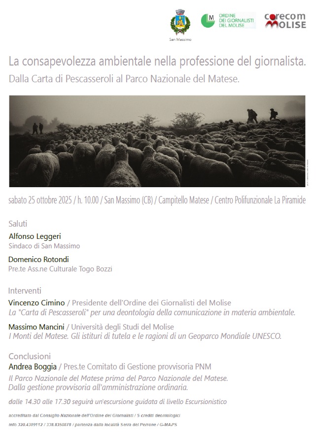 Sabato 25 ottobre, alle ore 10, presso il Centro Polifunzionale “La Piramide” di Campitello Matese (San Massimo – CB), l’Ordine dei Giornalisti del Molise, in collaborazione con il Corecom e con il patrocinio del Comune di San Massimo, promuoverà un incontro di alto profilo culturale e civile dedicato al tema “La consapevolezza ambientale nella professione del giornalista. Dalla Carta di Pescasseroli al Parco Nazionale del Matese.