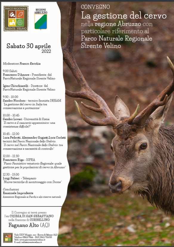 La gestione del cervo nella regione Abruzzo con particolare riferimento al Parco naturale regionale Sirente Velino sull’impronta segnata nel parco nazionale dello Stelvio. E’ il titolo del convegno in programma per sabato 30 aprile presso l’ex chiesa di San Sebastiano nella frazione di Corbellino, a Fagnano Alto (AQ). I lavori, moderati da Franco Recchia, prenderanno avvio alle ore 9 con i saluti di Francesco D’Amore, presidente del parco Sirente Velino e di Igino Chiuchiarelli, direttore del parco medesimo. A seguire gli interventi di Sandro Nicoloso, tecnico faunista Dream che parlerà della gestione del cervo in Italia, tra conservazione e protezione. Sandro Lovari, dell’Università di Siena, tratterà di “cervo e camoscio appenninico, una coesistanza difficile?”.