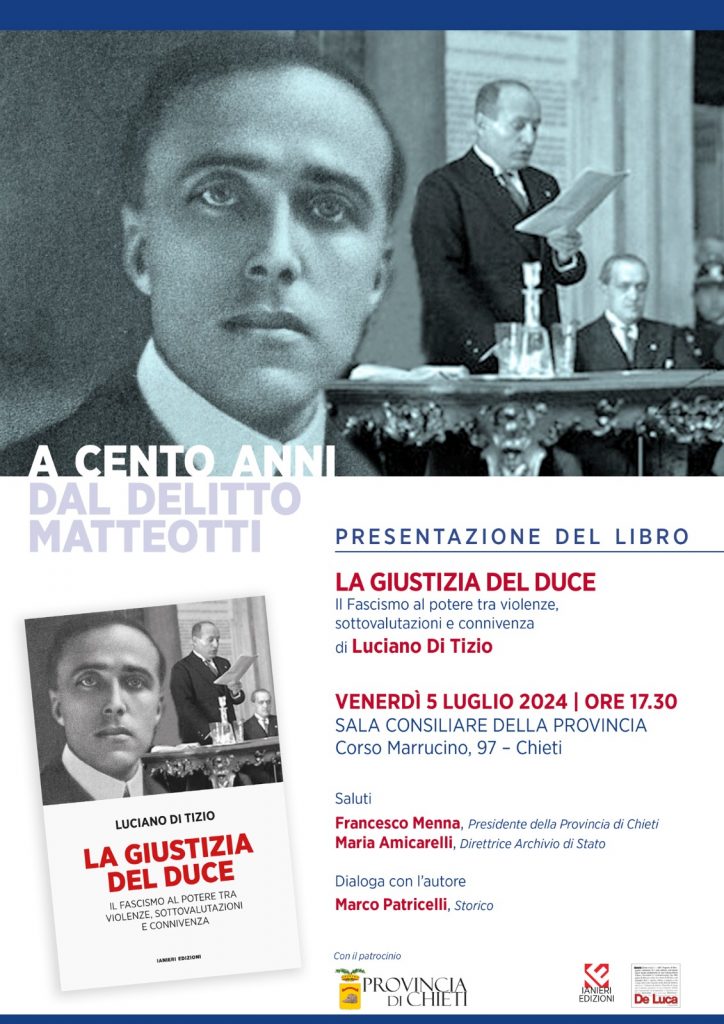 La Sala Consiliare della Provincia di Chieti ospita la presentazione del volume dell’autore Luciano Di Tizio, La giustizia del Duce, il Fascismo al potere tra violenze, sottovalutazioni e connivenza edito da Ianieri Edizioni: l’appuntamento è per venerdì 5 luglio alle ore 17.30, dialoga con l’autore lo Storico Marco Patricelli. Porteranno i saluti il Presidente della Provincia di Chieti, Francesco Menna e la Direttrice dell’Archivio di Stato, Maria Amicarelli. La prima presentazione di questo volume si è tenuta martedì 11 giugno presso la Sala Matteotti della Camera dei Deputati a Roma.