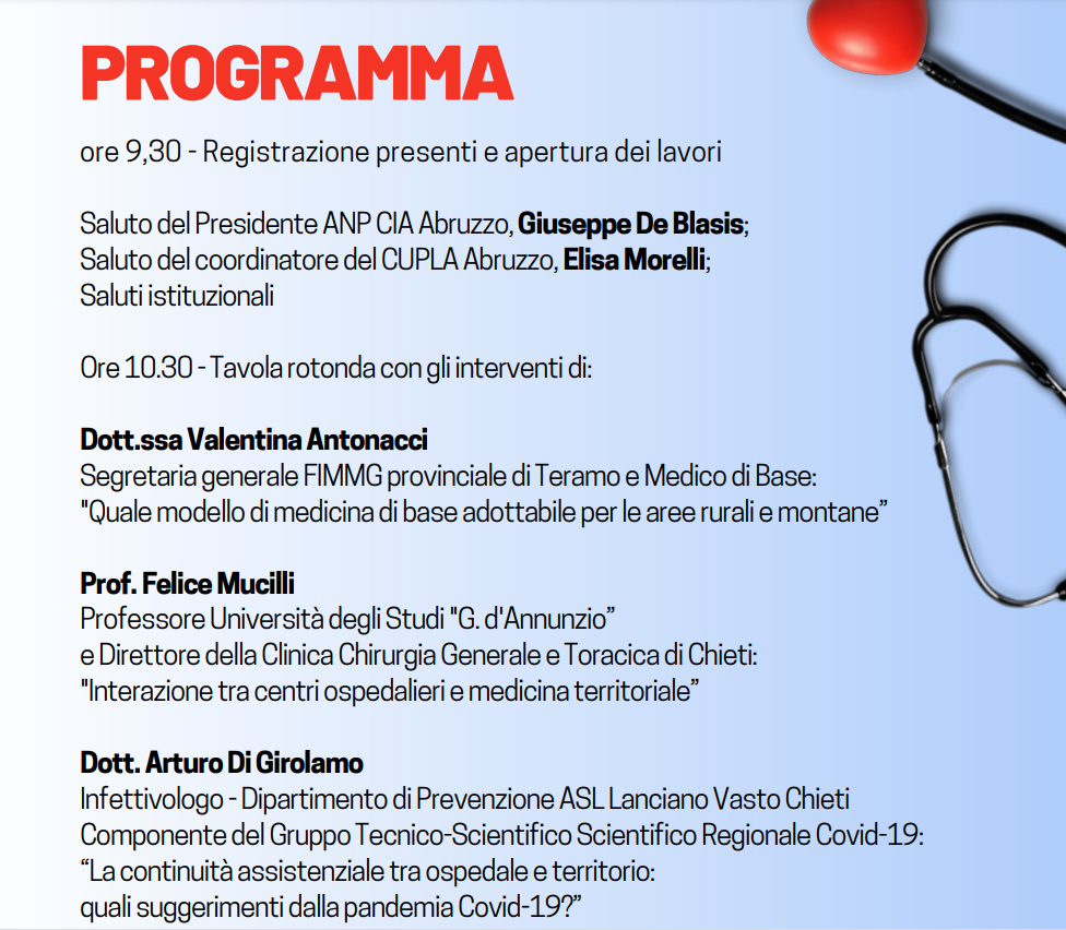 Un convegno sull’importante ruolo che la medicina di base svolge nelle comunità rurali e montane d’Abruzzo, affrontando le sfide uniche che tali aree geografiche presentano nel fornire assistenza sanitaria di qualità a tutti i cittadini. Questo il tema dell’appuntamento previsto per giovedì 22 giugno 2023, presso la Sala E. Camplone della Camera di Commercio Chieti-Pescara, in Via Conte di Ruvo, 2 a Pescara.