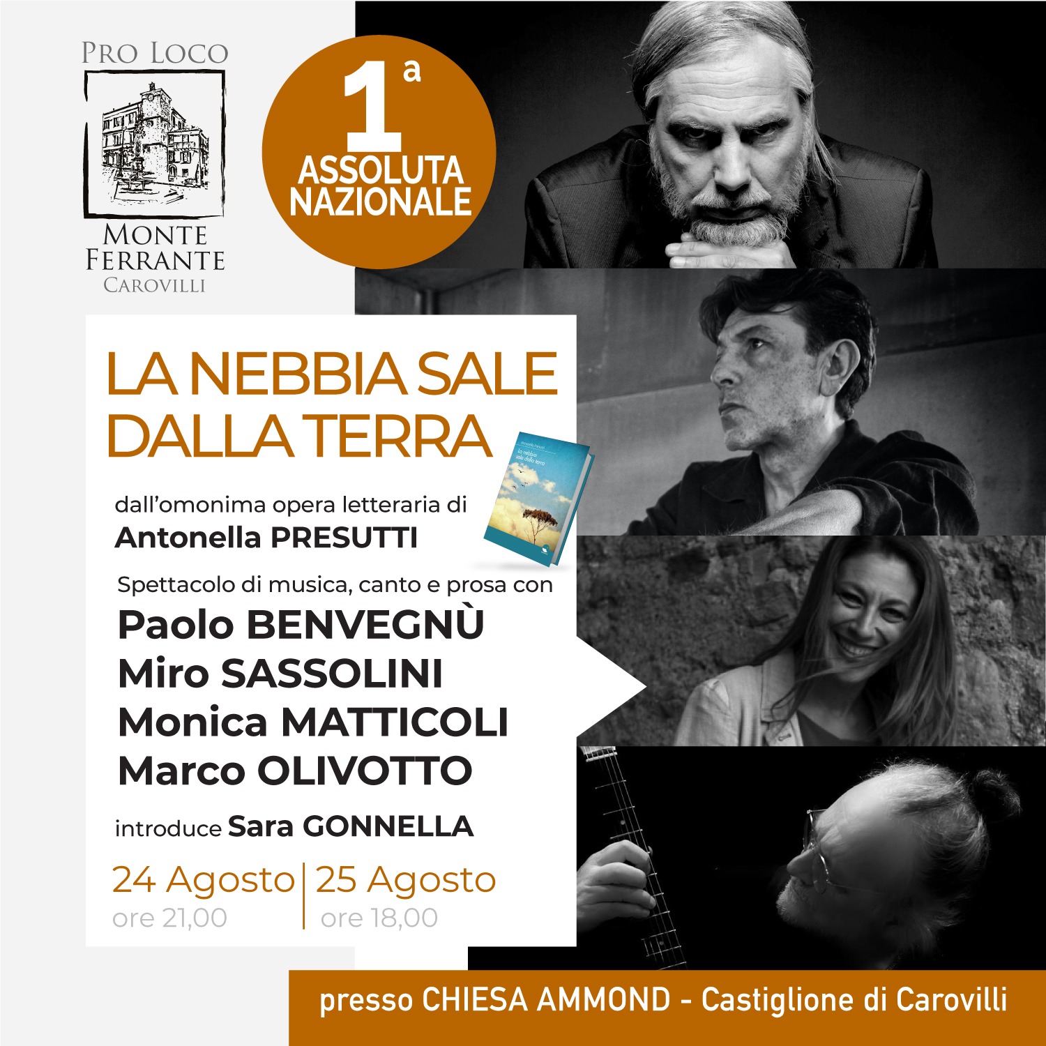 Mercoledì 24 agosto alle ore 21 la Pro Loco Monteferrante di Carovilli, è lieta di ospitare la prima nazionale dello spettacolo presso uno dei luoghi più suggestivi e magici del Molise, i Ruderi della Chiesa di San Nicola o Chiesa Ammond di Castiglione di Carovilli. Lo spettacolo verrà riproposto il 25 agosto alle ore 18.