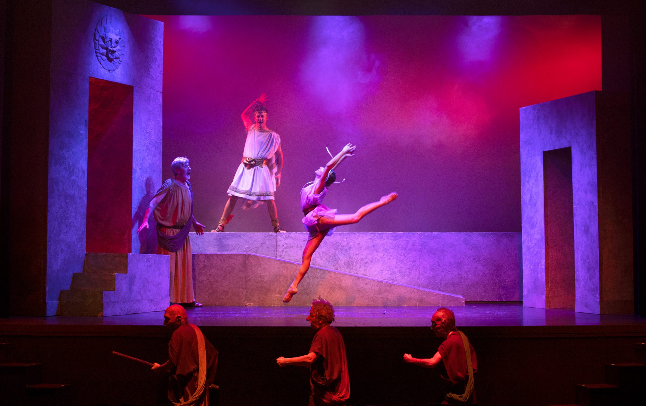 L’allestimento di Vincenzo Zingaro con la Compagnia Castalia e la produzione Mauri Sturno, crea una rappresentazione di notevole impatto, divertente e suggestiva, esaltando la chiave favolistica proposta dall’autore, recuperando gli aspetti più autentici e significativi del meraviglioso mondo della Commedia attica antica. Le maschere sono del celebre Studio Rino Carboni (maestro del trucco e degli effetti speciali nel cinema a livello mondiale, di cui ricordiamo il magnifico sodalizio con Federico Fellini): in scena Giovanni Ribò, Fabrizio Passerini, Rocco Militano, Piero Sarpa, Laura De Angelis, Mario Piana e Irene Catroppa.