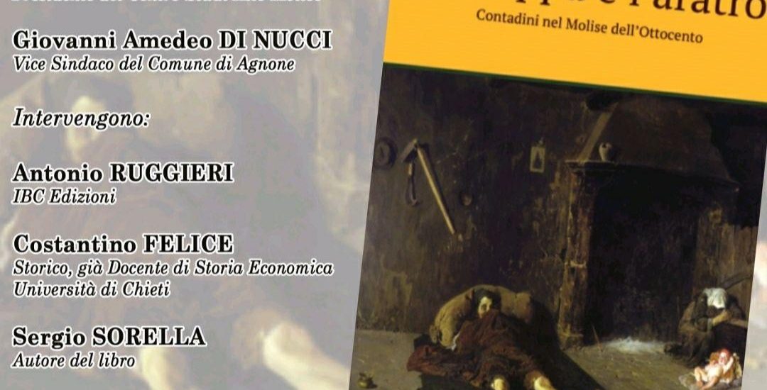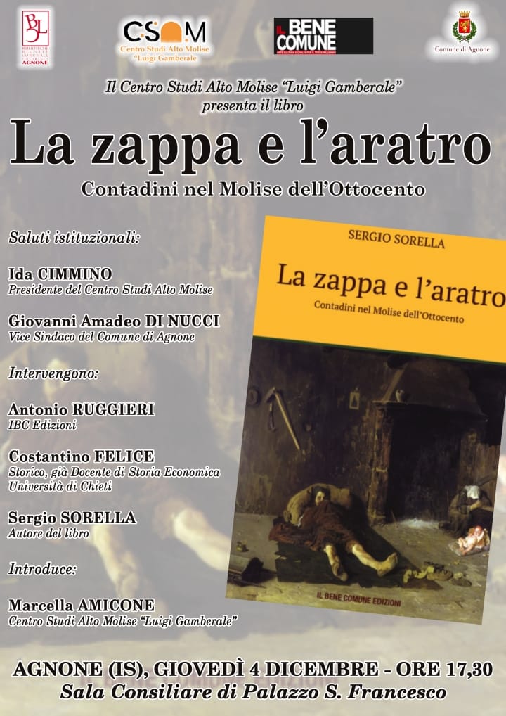 Giovedì 4 dicembre, alle ore 17:30, nella Sala Consiliare di Palazzo San Francesco, il Centro Studi Alto Molise presenta il Saggio di Sergio SorellaLa zappa e l’aratro. Contadini nel Molise dell’ottocento” per le edizioni IBC. Intervengono per parlarne, oltre all’autore, lo storico Costantino Felice, già docente di storia economica all’ Università d’Annunzio di Chieti, e Antonio Ruggieri, direttore de Il Bene Comune. Precedono i saluti del presidente del Centro Studi Ida Cimmino e del vice sindaco del Comune di Agnone Giovanni Amedeo Di Nucci. Introduce per il Centro Studi Marcella Amicone.