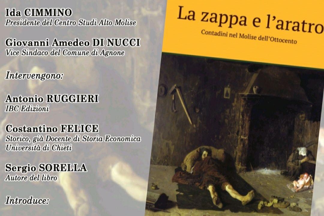 Giovedì 4 dicembre, alle ore 17:30, nella Sala Consiliare di Palazzo San Francesco, il Centro Studi Alto Molise presenta il Saggio di Sergio Sorella “La zappa e l’aratro. Contadini nel Molise dell’ottocento” per le edizioni IBC. Intervengono per parlarne, oltre all’autore, lo storico Costantino Felice, già docente di storia economica all’ Università d’Annunzio di Chieti, e Antonio Ruggieri, direttore de Il Bene Comune. Precedono i saluti del presidente del Centro Studi Ida Cimmino e del vice sindaco del Comune di Agnone Giovanni Amedeo Di Nucci. Introduce per il Centro Studi Marcella Amicone.