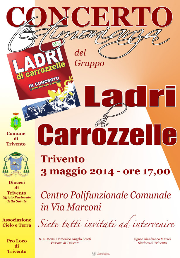 La Diocesi di Trivento, in stretta collaborazione con il Comune di Trivento, l’Associazione Cielo e terra e la locale Pro-Loco ha organizzato il concerto testimonianza del gruppo “Ladri di carrozzelle”, composto da disabili anche con patologie gravi, che vogliono testimoniare a tutti come la vita non è mai inutile ed è una preziosa occasione che consente di realizzarsi anche se portatori di qualche handicap.Un vero messaggio gioioso alla vita rivolto soprattutto a giovani ed adulti per apprezzare l’inestimabile dono dell’esistenza e a non sciuparla banalmente.