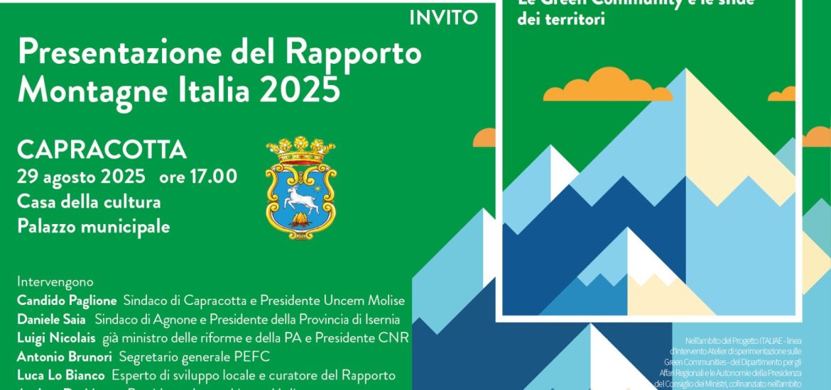 A Capracotta venerdì 29 agosto alle 17, presso la Casa della Cultura nel Palazzo Municipale, Uncem presenta il Rapporto Montagne Italia 2025: un lavoro corposo e strutturato, che nasce nell’ambito del Progetto Italiae del Dipartimento per gli Affari Regionali e le Autonomie della Presidenza del Consiglio dei Ministri ed è attuato dall’Uncem per descrivere come si manifesta la contemporaneità nei territori di montagna. L’Appennino non è territorio dello “spopolamento”, parola da eliminare dal vocabolario secondo Uncem, e non è vittima dell’abbandono. Il Rapporto sulla Montagna si può trovare qui: https://www.store.rubbettinoeditore.it/catalogo/rapporto-montagne-italia-2025/?highlight=montagne