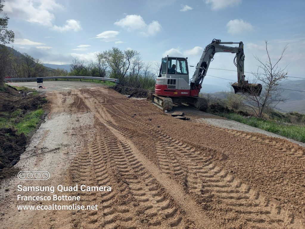 Andando oltre, in direzione Abruzzo, invece, si incontrano solo smottamenti e un cedimento della strada già sistemato. Su uno di questi, il più importante per dimensioni, stanno operando i mezzi meccanici per tentare di aprire un varco che consentirebbe, nell’immediato, di ricollegare le due comunità al di qua e al di là del Sente. Riaprendo quel tratto, infatti, sarebbe possibile poi lasciare la ex statale Istonia e percorrere alcune strade comunali di Belmonte del Sannio già sistemate in somma urgenza e raggiungere infine la sponda molisana, bypassando dunque il tratto più dissestato, quello in frana.