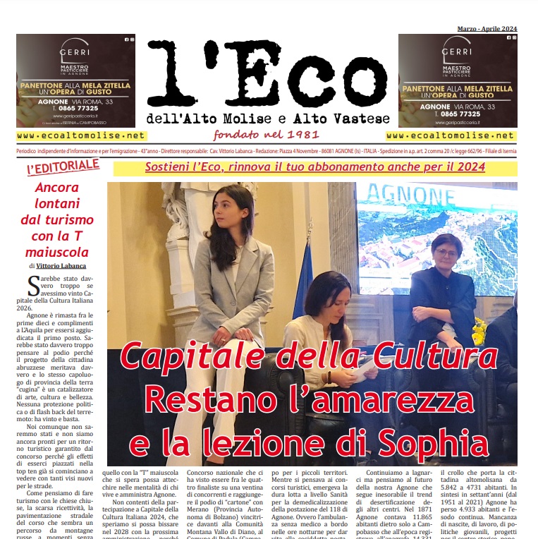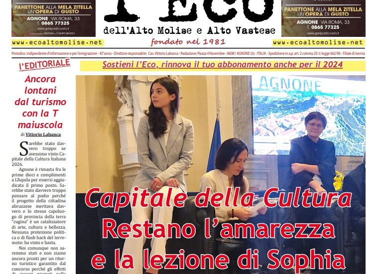 Capitale italiana della Cultura, elezioni provinciali e referendum per tornare con l’Abruzzo. Sono alcuni dei tempi trattati da l’Eco de l’Alto Molise – Vastese che torna in edicola con un numero tutto nuovo. Nelle dodici pagine approfondimenti, interviste, sport e foto esclusive. Corri in edicola e prenota una copia. Intanto partita la verifica degli abbonamenti per le annualità 2023 – 2024. L’invito è di mettersi in regola con i pagamenti che coprono le spese di spedizione e stampa. Sostieni l’Eco, voce indipendente del tuo territorio!