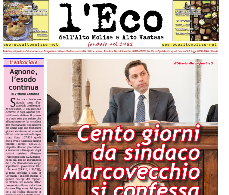 E’ in edicola il nuovo numero de l’Eco Alto Molise – Vastese, il mensile del tuo territorio. In questa edizione intervista a 360 gradi al sindaco Lorenzo Marcovecchio che parla dei suoi primi cento giorni di governo e dei progetti da mettere in campo per il futuro. Ponte con gli emigranti: il Cenacolo Culturale Camillo Carlomagno prepara la trasferta in Argentina, tutti i particolari nel servizio a pagina 4. Ed ancora: come inventarsi un lavoro, lo spiega l’agnonese Marco Cacciavillani, ex informatico della Ittierre Spa che ha realizzato la prima fattoria didattica in Alto Molise. Inaugurazioni della scuola di Poggio Sannita e del Residenze per anziani Tavola Osca di Agnone, lo speciale fotografico. Lo sport con il fenomeno Olympia Agnonese prima della classe del girone F: mai così in alto in 50 anni di storia. Inoltre la società granata tramite l’Eco ha inteso pubblicare il rendiconto di gestione della stagione 2015-2016 e quello di previsione per l’attuale campionato. Questi e tanti altri contenuti nell’ultimo numero de l’Eco. Non resta che correre in edicola a prenotare una copia.