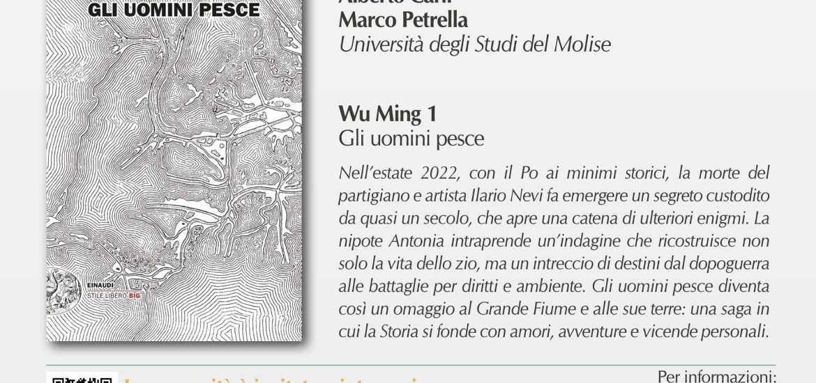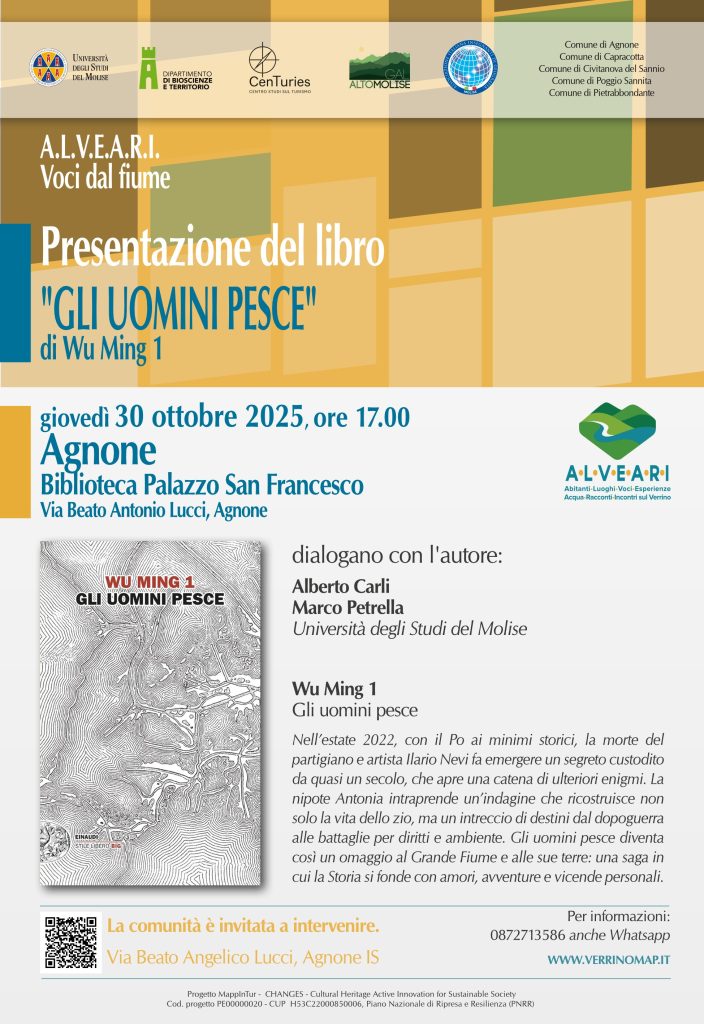 Il 30 ottobre alle ore 17, a Palazzo San Francesco in Agnone, nell’ambito delle attività legate al progetto di ricerca e di animazione territoriale sul fiume Verrino, si terrà la presentazione del romanzo “Gli uomini pesce” di Wu Ming 1 (Einaudi). L’incontro mette in dialogo letteratura, paesaggi d’acqua e comunità, proseguendo il lavoro avviato con MappInTur (coordinato da Marco Petrella) sulle visioni della valle del Verrino come spazio di memoria, confronto e futuro sostenibile.
