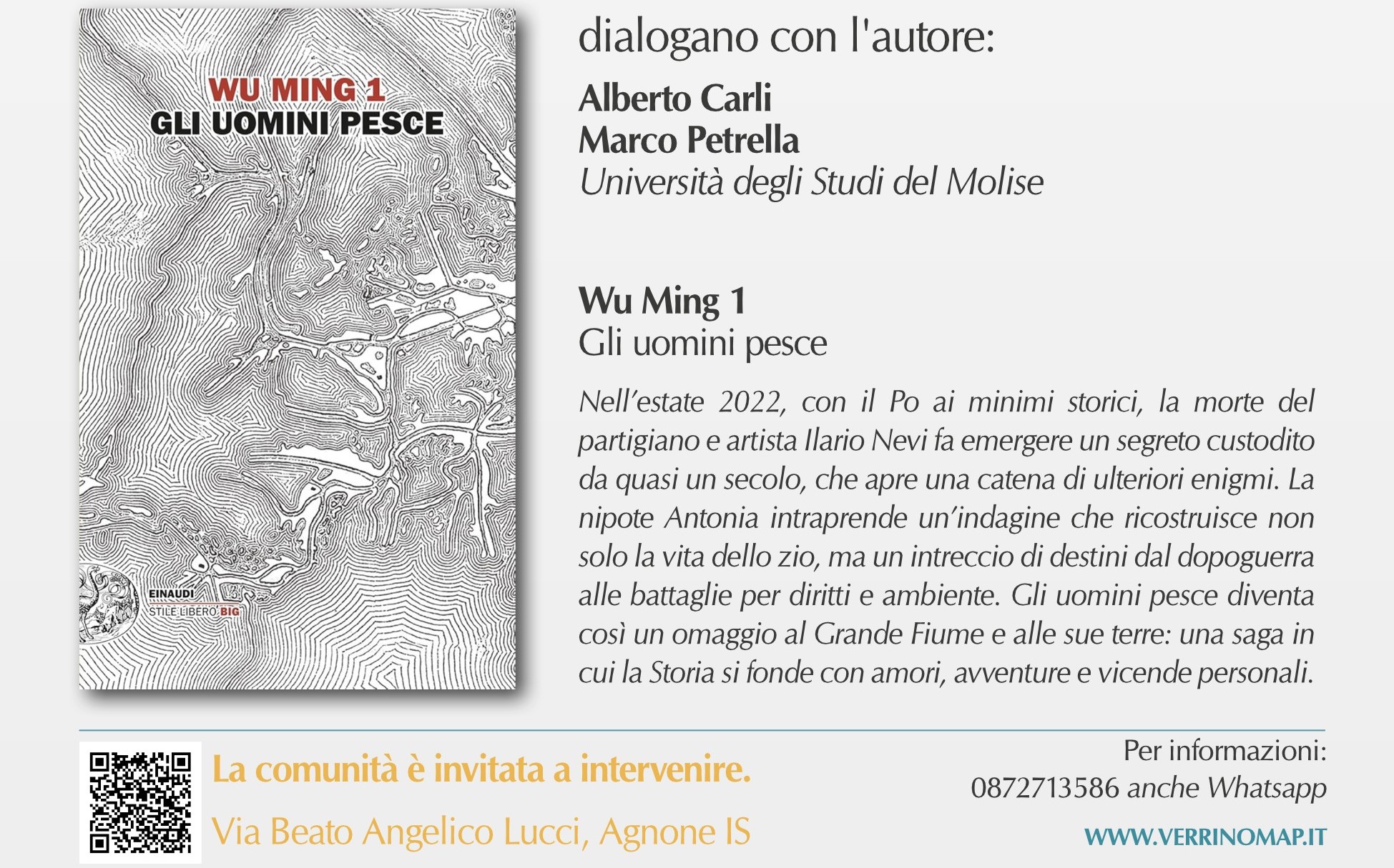 Il 30 ottobre alle ore 17, a Palazzo San Francesco in Agnone, nell’ambito delle attività legate al progetto di ricerca e di animazione territoriale sul fiume Verrino, si terrà la presentazione del romanzo “Gli uomini pesce” di Wu Ming 1 (Einaudi). L’incontro mette in dialogo letteratura, paesaggi d’acqua e comunità, proseguendo il lavoro avviato con MappInTur (coordinato da Marco Petrella) sulle visioni della valle del Verrino come spazio di memoria, confronto e futuro sostenibile.