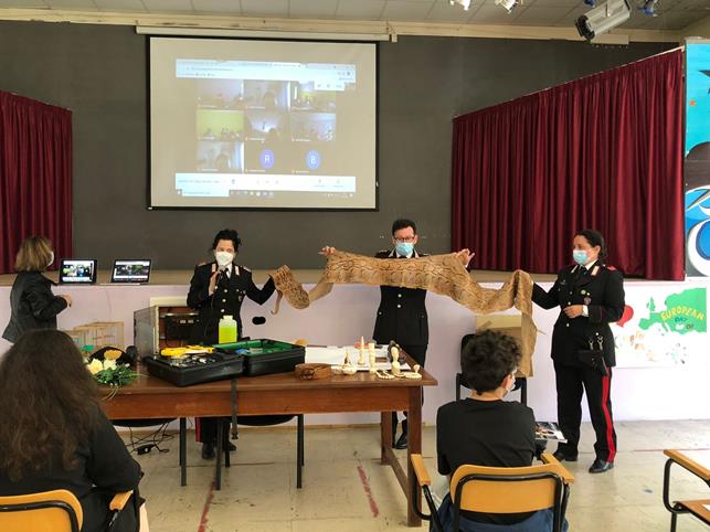 I militari del Gruppo Carabinieri Forestale di Pescara, coadiuvati dal locale Nucleo Cites, hanno concluso nei giorni scorsi le lezioni di legalità ambientale presso la Scuola Media Statale “L. Antonelli” di Pescara. Dopo quella svolta in videoconferenza con il Liceo Artistico Musicale Coreutico “Misticoni – Bellisario” di Pescara, l’iniziativa, richiesta dalla Dott.ssa Rossella Di Donato, Dirigente Scolastico dell’Istituto Comprensivo “Pescara 7”, si è svolta mediante due incontri, il primo l’11 maggio e il secondo il 13, che hanno coinvolto in totale 18 classi con i loro insegnanti, due soltanto in presenza nell’Aula Magna dell’Istituto e le altre, per evitare i pericoli di contagio dal virus della COVID-19, in collegamento diretto dalle loro aule.