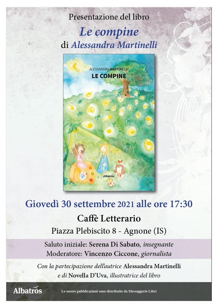La presentazione del libro ‘Le compine’ di Alessandra Martinelli, in programma giovedì 30 settembre al Caffè Letterario di Agnone (ore 17,30), è stato rinviato a giovedì 7 ottobre. E’ quanto comunicano gli organizzatori dell’evento.