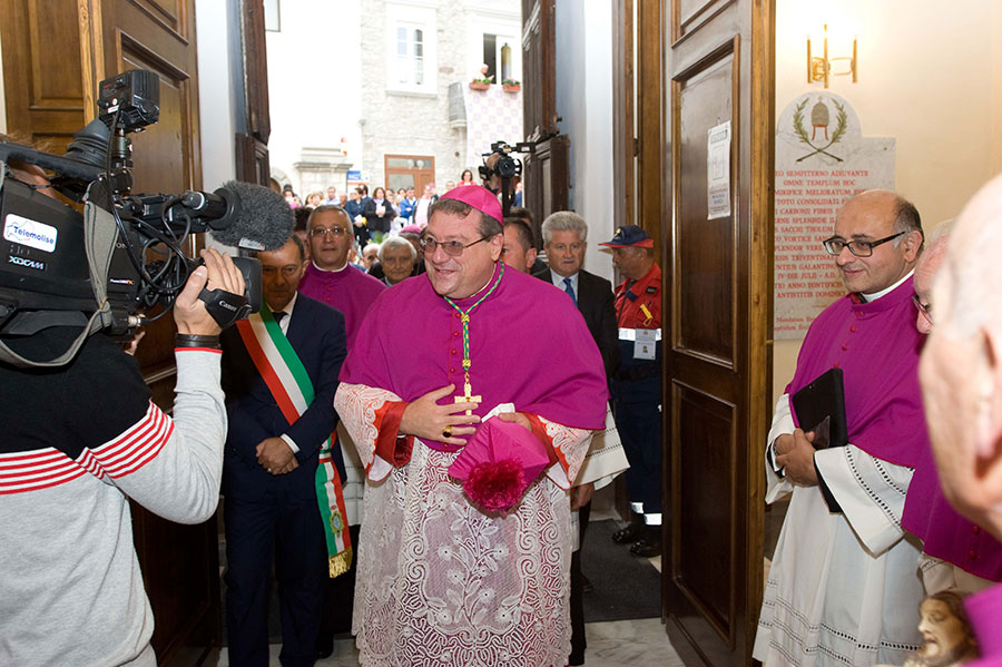 Casto e presso l’attiguo Centro della Caritas diocesana, per poi arrivare a Piazza Fontana a Trivento, dove è stato accolto dal sindaco della città e dalle altre Autorità presenti. Subito dopo aver ricevuto gli onori del picchetto militare e la salva d’onore, il sindaco di Trivento, Domenico Santorelli, ha rivolto al Nuovo Pastore un indirizzo di Benvenuto. Il nuovo Vescovo seguito da una immensa moltitudine di