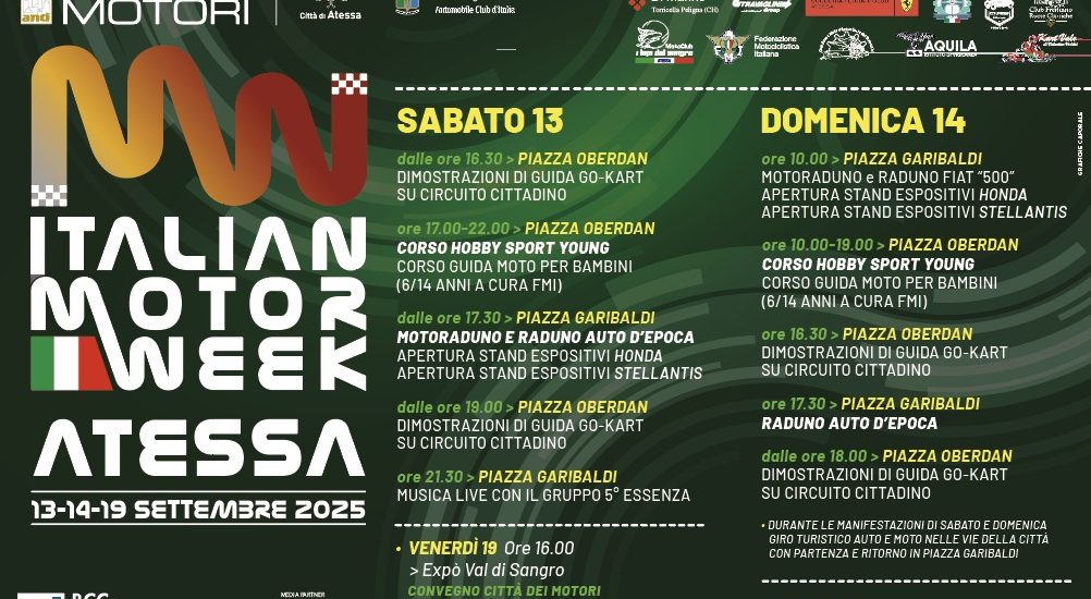 L’Italian Motor Week 2025, la manifestazione che mira a valorizzare il turismo motoristico nazionale, organizzata da ‘Città dei Motori’, la rete Anci che associa quaranta Comuni del ‘Made in Italy’ del settore, vedrà tra i protagonisti anche la città di Atessa.