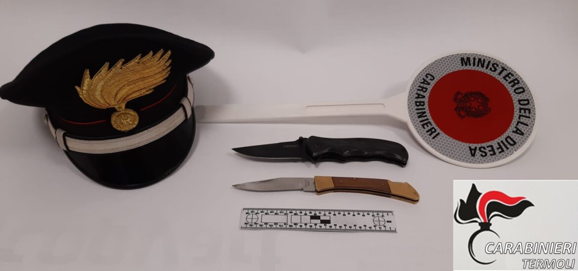 Nella circostanza i due minorenni incensurati presenti sul posto, un 16enne residente a San Severo (FG) ed un 17enne residente a Campobasso, venivano identificati e sottoposti a perquisizione personale, venendo trovati ciascuno in possesso di un coltello a serramanico della lunghezza complessiva di cm 20 con lama di cm 8,5.