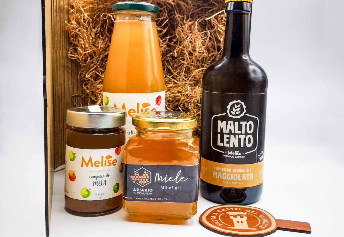Nella confezione, che può essere spedita in tutta Italia, c’è una bottiglia di Nettare di Mela (720 ml) con succo al 30% e nettare al 50% e una Confettura di Mela (220ml) dell’azienda agricola biologica Melise, una birra agricola “Maggiolata” del birrificio Malto Lento in stile American Blonde Ale 4,3% (0,50 cl) e un barattolo di Miele millefiori dell’Apiario di Comunità di Castel del Giudice (440 gr). Le composte di mele e i succhi di frutta nascono dai meleti biologici Melise, coltivati a Castel del Giudice, dove i terreni un tempo abbandonati sono stati recuperati per dare vita a 40 ettari destinati all’agricoltura biologica. Sono state recuperate anche varietà di mele autoctone molisane e abruzzesi, che si possono ammirare nel Giardino delle Mele Antiche.