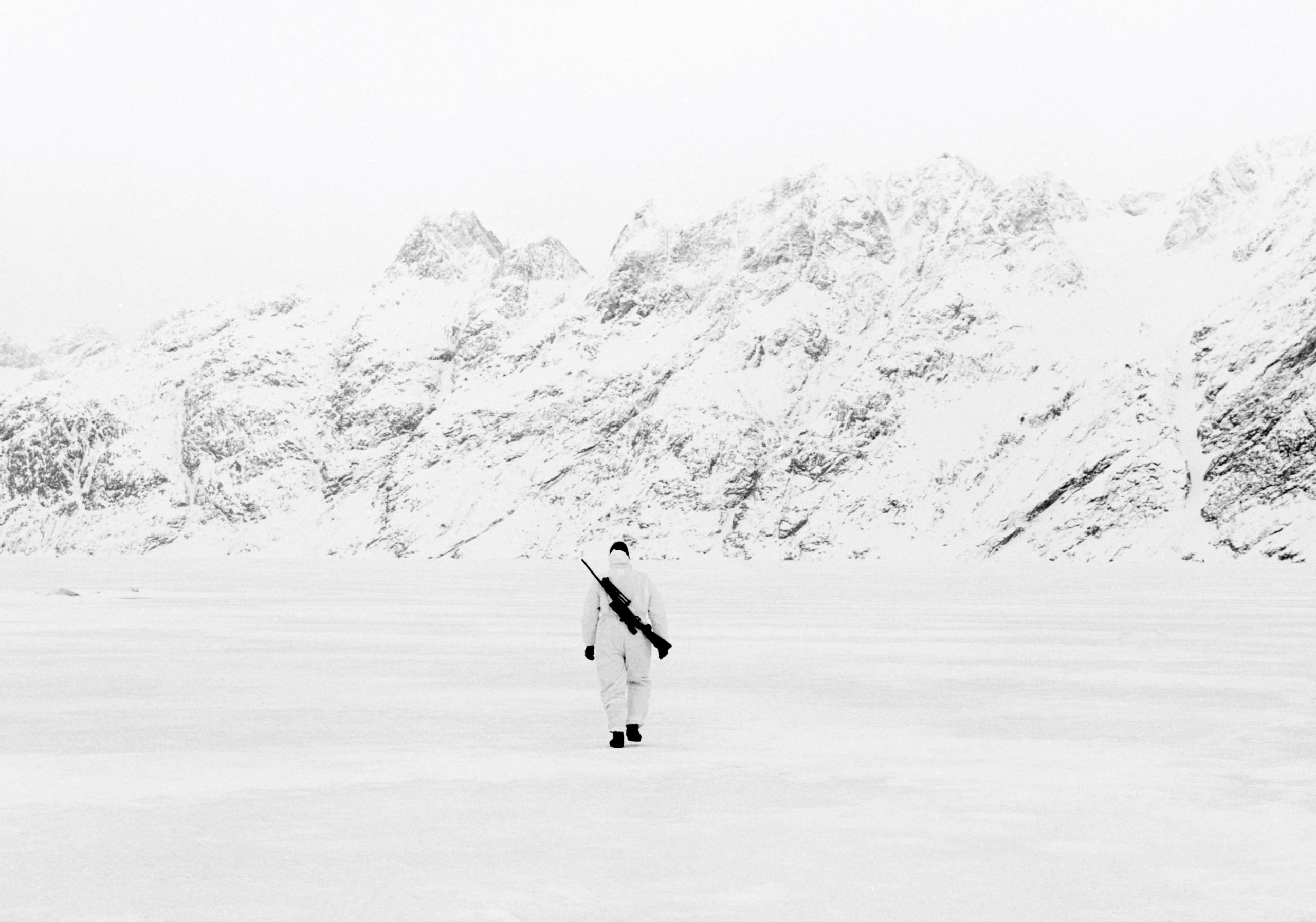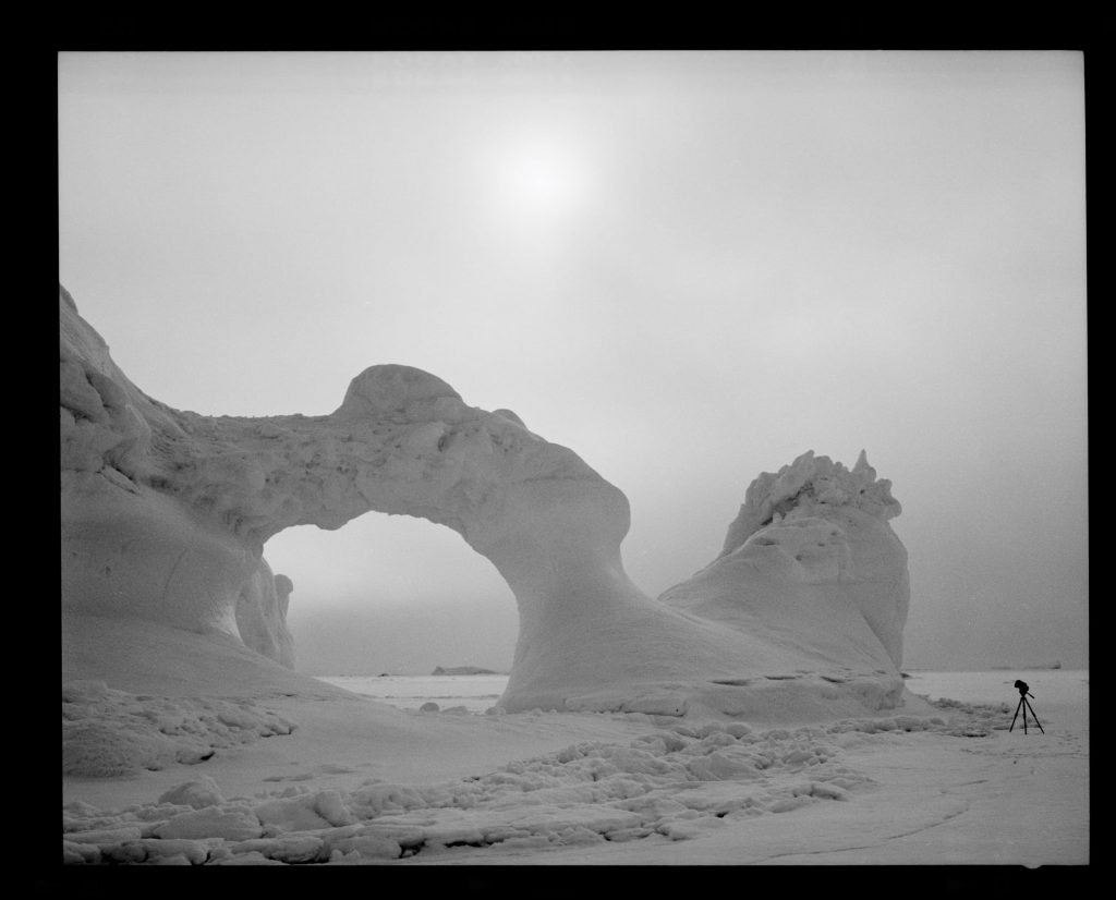 Paolo Solari Bozzi è uno dei rari fotografi – insieme a lui menzioniamo Ragnar Axelsson e Carsten Egevang – che ha deciso di raccontare la Groenlandia in maniera professionale, con gli ampi spazi, bianchi e profondi, contaminati dalla sporadica presenza dell’uomo: un mondo, di luce e silenzio, catturato su pellicola in diversi viaggi grazie all’impiego di attrezzatura fotografica analogica. Un’autonomia di pochi scatti per sessione fotografica (da 4 a 10), una fotografia lenta e ancor più rallentata dalle condizioni ambientali con le temperature artiche dell’inverno groenlandese che raggiungono le punte più estreme della Terra, fino ai a -60 gradi.