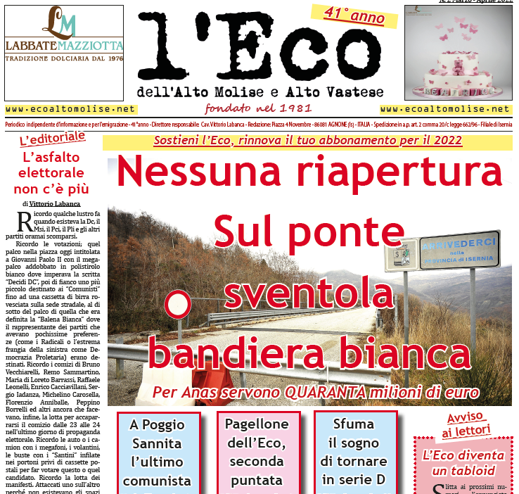 In stampa l’ultimo numero de l’Eco de l’Alto Molise – Vastese che in questo numero propone all’attenzione degli abbonati – lettori diversi approfondimenti tra cui quello del viadotto ‘Sente – Longo’ che rimarra chiuso. Non solo, nell’edizione che uscirà nelle edicole cittadine in formato ancora classico, intervista a tutto campo all’ex sindaco di Poggio Sannita, Pasquale Di Filippo, l’ultimo comunista. E poi la ‘guerra’ di carte bollate tra Castel del Giudice e Pietrabbondante per l’assegnazione dei 20 milioni di euro del bando nazionale del Pnrr e la seconda ed ultima puntata del pagellone sull’amministrazione comunale di Agnone. Nelle pagine interne sport e altre curiosità che riguardano le notizie del territorio. Non resta che correre in edicola e prenotare una copia.
