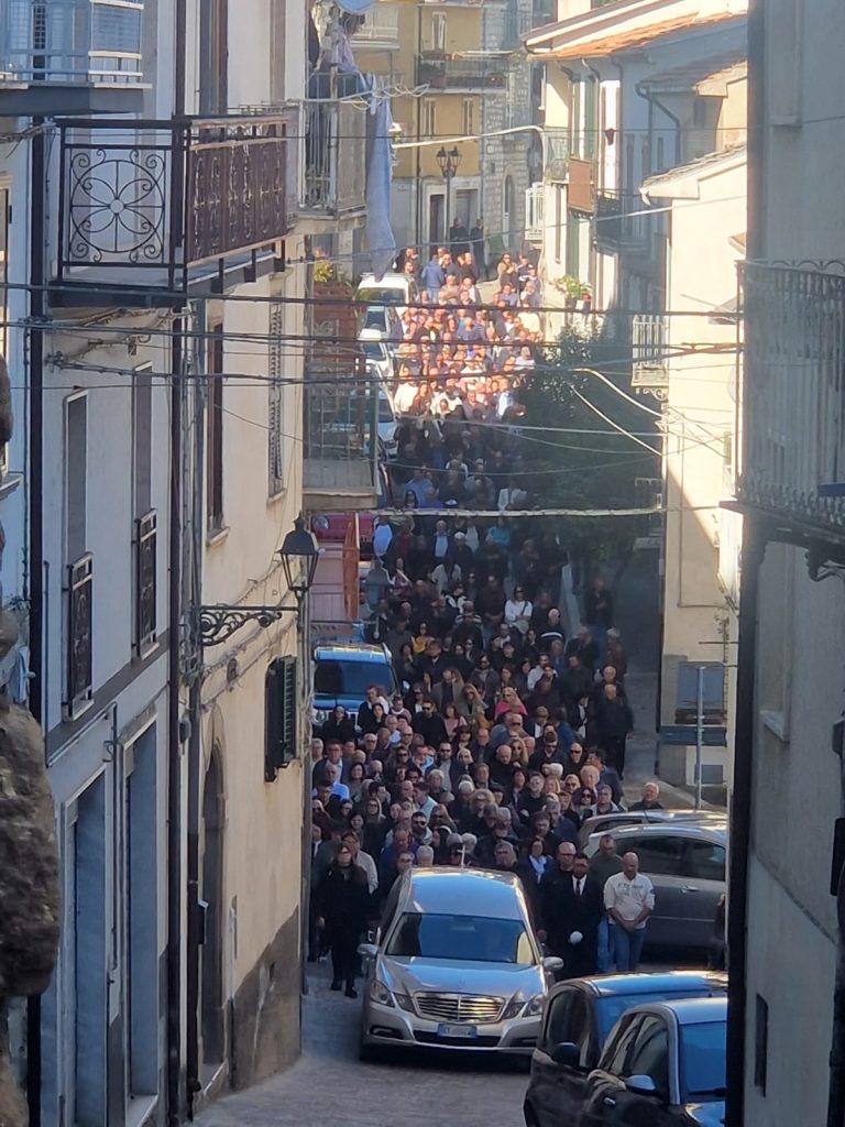“Ciao Lino”, “Non ti dimenticheremo mai”, “Riposa in pace gigante buono”. Una bacheca improvvisata di dolore e memoria che tappezza le pietre antiche del borgo, testimonianza visibile di quanto questo ragazzo fosse amato. Quando le note solenni dell’organo di Santa Vittoria hanno accompagnato l’uscita del feretro, fuori si è compiuto l’ultimo, straziante atto di questo dramma collettivo. La marea di persone che non aveva potuto assistere alla celebrazione si è aperta in un corridoio umano. E mentre la bara veniva portata verso il carro funebre, è esploso un applauso. Lungo, liberatorio, carico di tutto il dolore che le lacrime non riuscivano più a esprimere. Un applauso per Lino, per la sua vita breve ma intensa, per la sua scelta coraggiosa di restare, per il suo sorriso che non si spegnerà mai nella memoria di chi lo ha conosciuto.