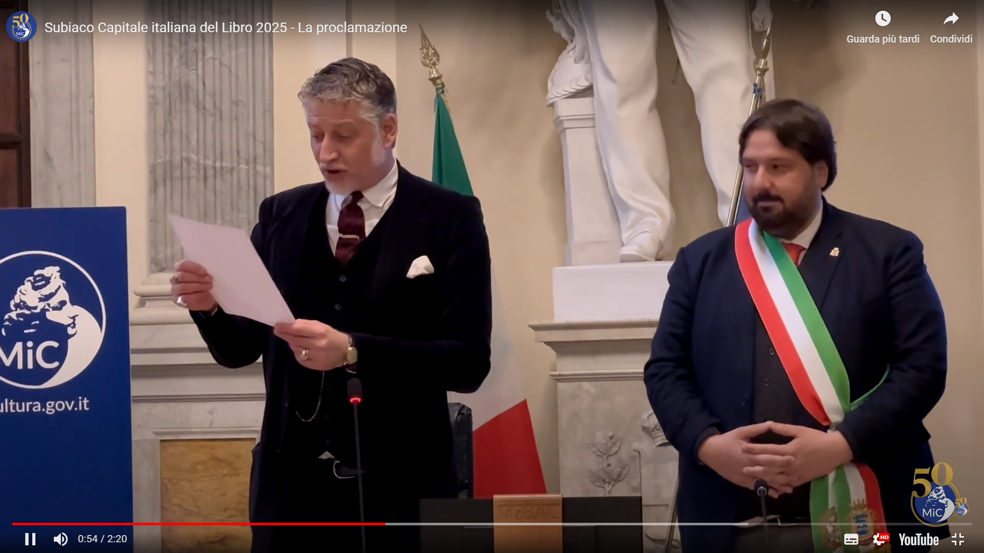 Subiaco è la Capitale italiana del Libro 2025. A proclamarla, nel corso di una conferenza stampa che si è svolta a Roma, al Ministero della Cultura, è stato il Ministro Alessandro Giuli, con la seguente motivazione:  https://youtu.be/_wpaDLWGWRU “Il progetto presentato…