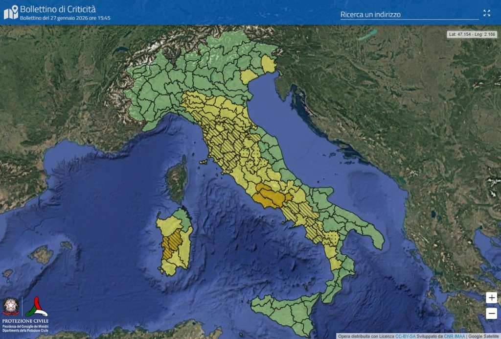 Sulla base dei fenomeni previsti e in atto è stata valutata per la giornata di domani, mercoledì 28 gennaio, allerta arancione su parte di Sardegna, Lazio eMolise, inoltre è stata valutata allerta gialla su Toscana, Campania, Umbria, gran parte di Sardegna, Lazio, Emilia-Romagna, Molise, Abruzzo e parte di Calabria, Basilicata, Marche, Veneto e Friuli-Venezia Giulia.