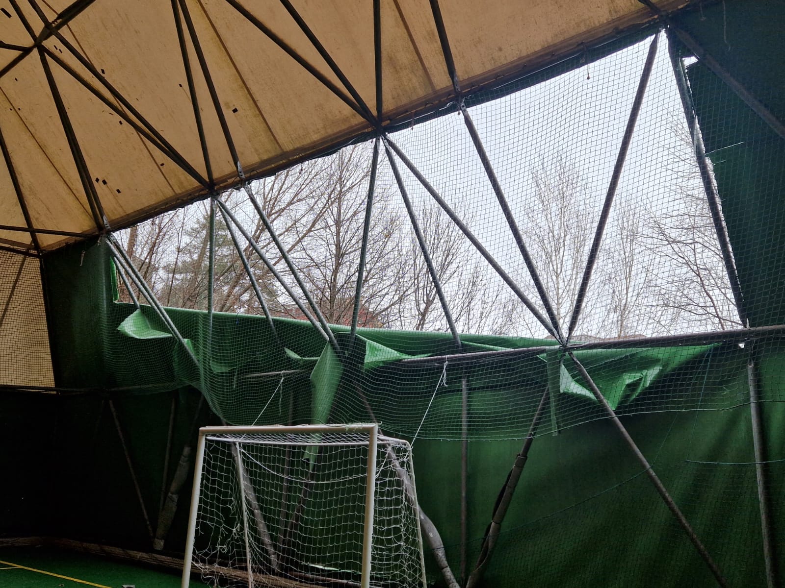 Le forti raffiche di vento spirate la notte scorsa hanno danneggiato la copertura dell’impianto di calcio a cinque in località Tiro a Segno. Come testimoniano le foto de l’Eco, parte del telo in pvc è stato divelto. Altri danni si registrano alla porta di ingresso che non ha retto alle folate che in alcuni casi hanno superato i cento chilometri orari.