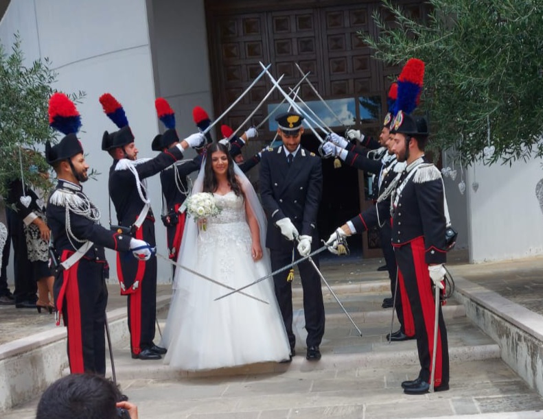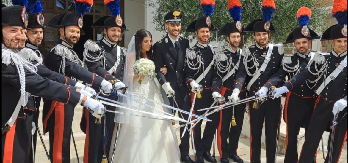 E siccome si tratta di un matrimonio dell’Arma, non poteva mancare il picchetto d’onore, con le sciabole sfoderate, all’uscita degli sposi dalla chiesa, finalmente marito e moglie.