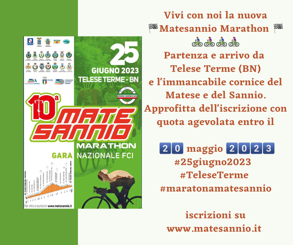 Manca davvero poco, ancora qualche ora, ci sarà tempo fino a domenica 20 maggio, per approfittare dell’iscrizione con quota agevolata all’edizione 2023 della Matesannio Marathon in programma per il prossimo 25 giugno con partenza e arrivo è previsto a Telese Terme (BN) ma toccherà tanti centri casertani. Un percorso unico che attraverserà 14 Comuni: sia casertani che beneventani, del territorio matesino. Ciclisti ed amanti delle due ruote si ritroveranno nella ridente cittadina termale, alle 8.30 del mattino del 25 giugno, per percorrere i 105 km che passeranno per Bocca della Selva, punto più alto della corsa ciclistica, ad un’altitudine di 1409 metri.