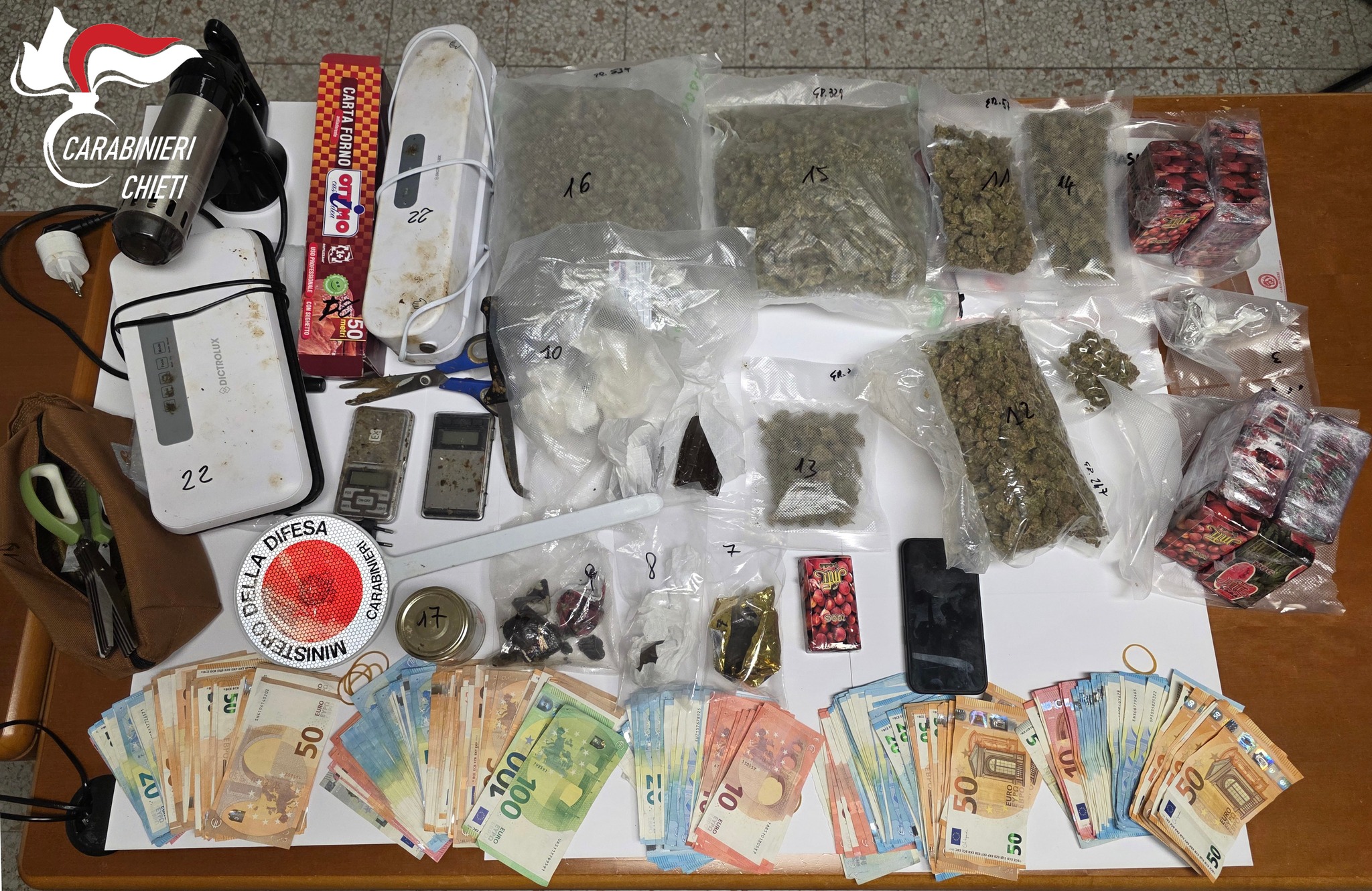 L’attività investigativa è poi proseguita con una perquisizione presso un garage in uso al ragazzo, sempre nel comune di Lanciano, dove i militari hanno scoperto un vero e proprio deposito di sostanze stupefacenti: