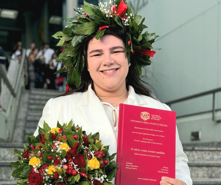 Felicitazioni vivissime alla neo dottoressa Mina Camperchioli di Poggio Sannita, che oggi presso l’Università di Teramo, ha brillantemente conseguito la laurea magistrale in Scienze della Comunicazione, dipartimento “Media, Arti e Culture”. Tema della tesi discussa: «Formati e linguaggi della serialità televisiva. Il calcio come evento mediale. Dalla televisione al second screen», relatore il chiarissimo professore Gianluigi Rossini. Alla neo dottoressa Mina, gli auguri e le felicitazioni in primis di mamma Dora e papà Tonino, di nonno Nicola, di tutti i familiari, con particolare riferimento allo zio Bruno e dei tantissimi amici. E si associa alle congratulazioni anche la redazione dell’Eco.