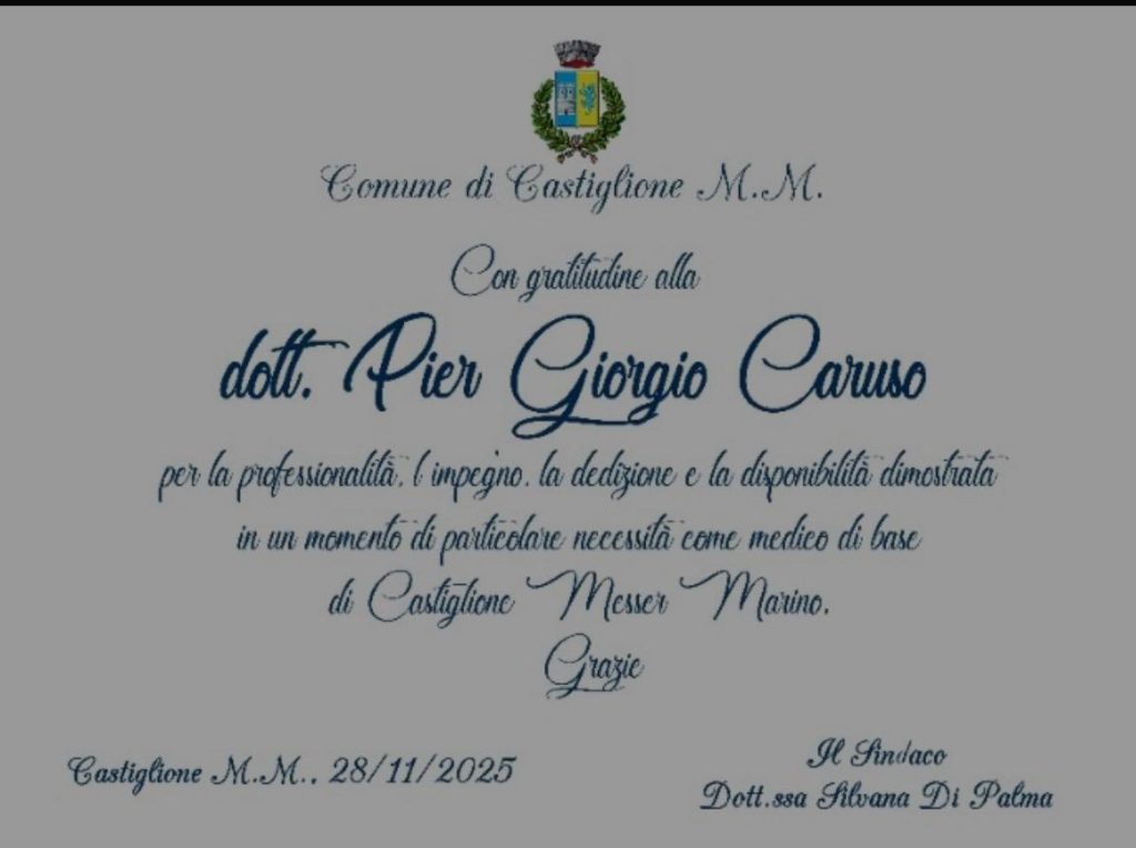 «Il Comune di Castiglione Messer Marino ha voluto salutare con affetto e profonda gratitudine il dottor Caruso, che in questo ultimo anno ha seguito la nostra comunità con professionalità, dedizione e grande umanità. – commenta la sindaca – In un periodo complesso, segnato dalla forte carenza di medici di famiglia, la sua presenza è stata fondamentale per tanti cittadini. Grazie di cuore, dottore, per ciò che ha fatto per Castiglione».