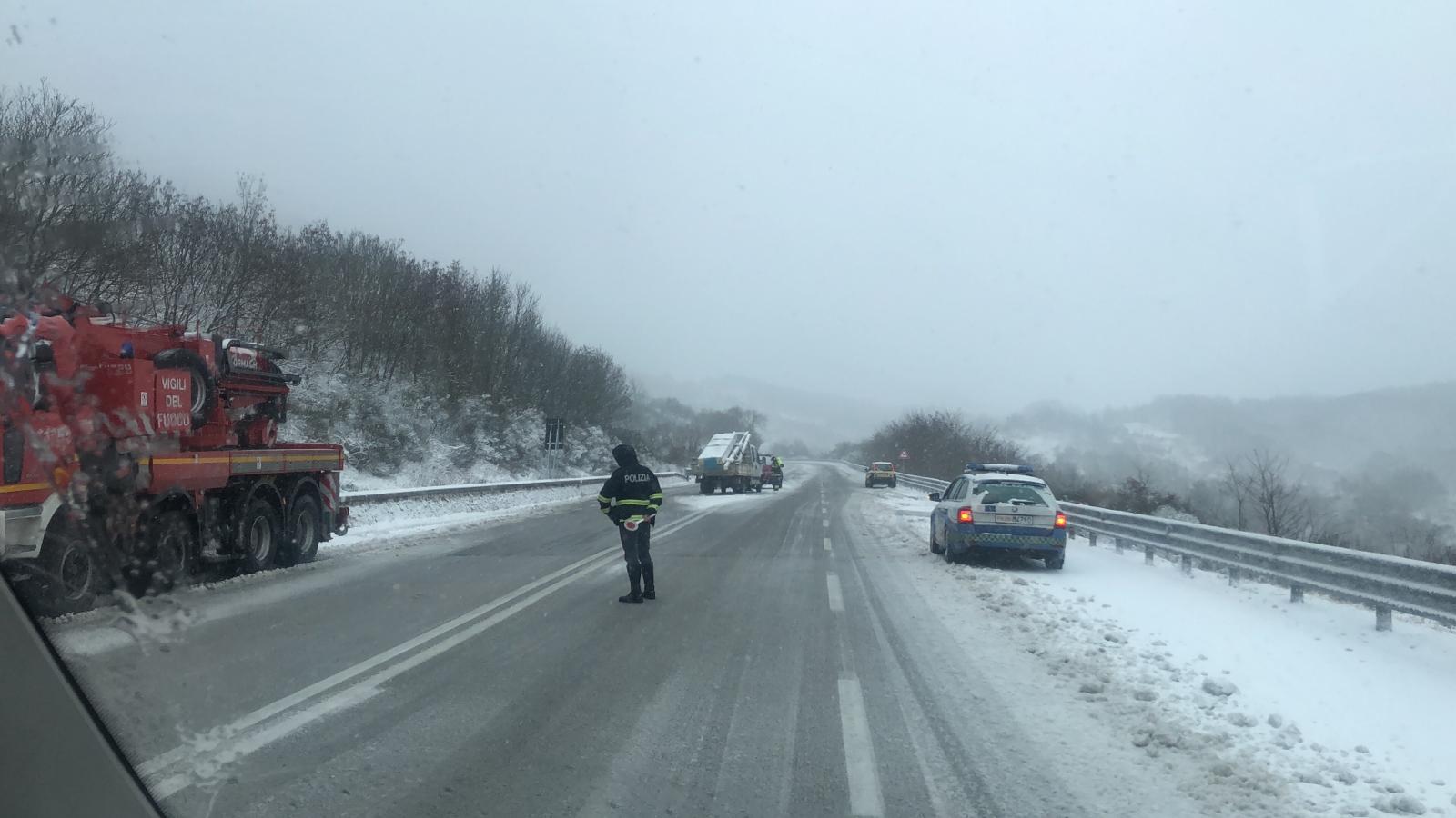 Oltre alle operazioni di sgombero del mezzo in panne, anche la neve sta rendendo disagevole il transito sull’importante arteria di collegamento. Mezzi pesanti incontrano difficoltà, nonostante il passaggio continuo dei mezzi spazzaneve.