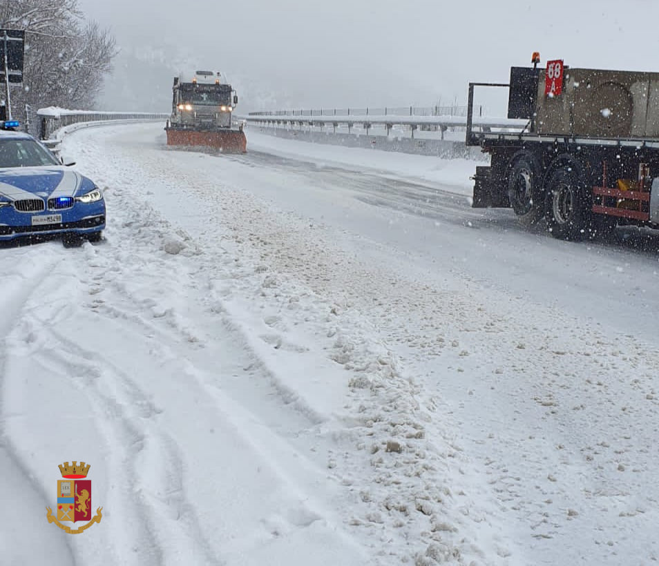 In A24, in particolare nel tratto tra Assergi e Teramo, la circolazione dei mezzi pesanti è stata agevolata nei tratti di maggiore criticità da operazioni “pilotaggio” che gli operatori della Polizia Stradale effettuano con estrema professionalità a beneficio di più mezzi pesanti accodati, dopo che sulla tratta erano già intervenuti mezzi spartineve e spargisale.